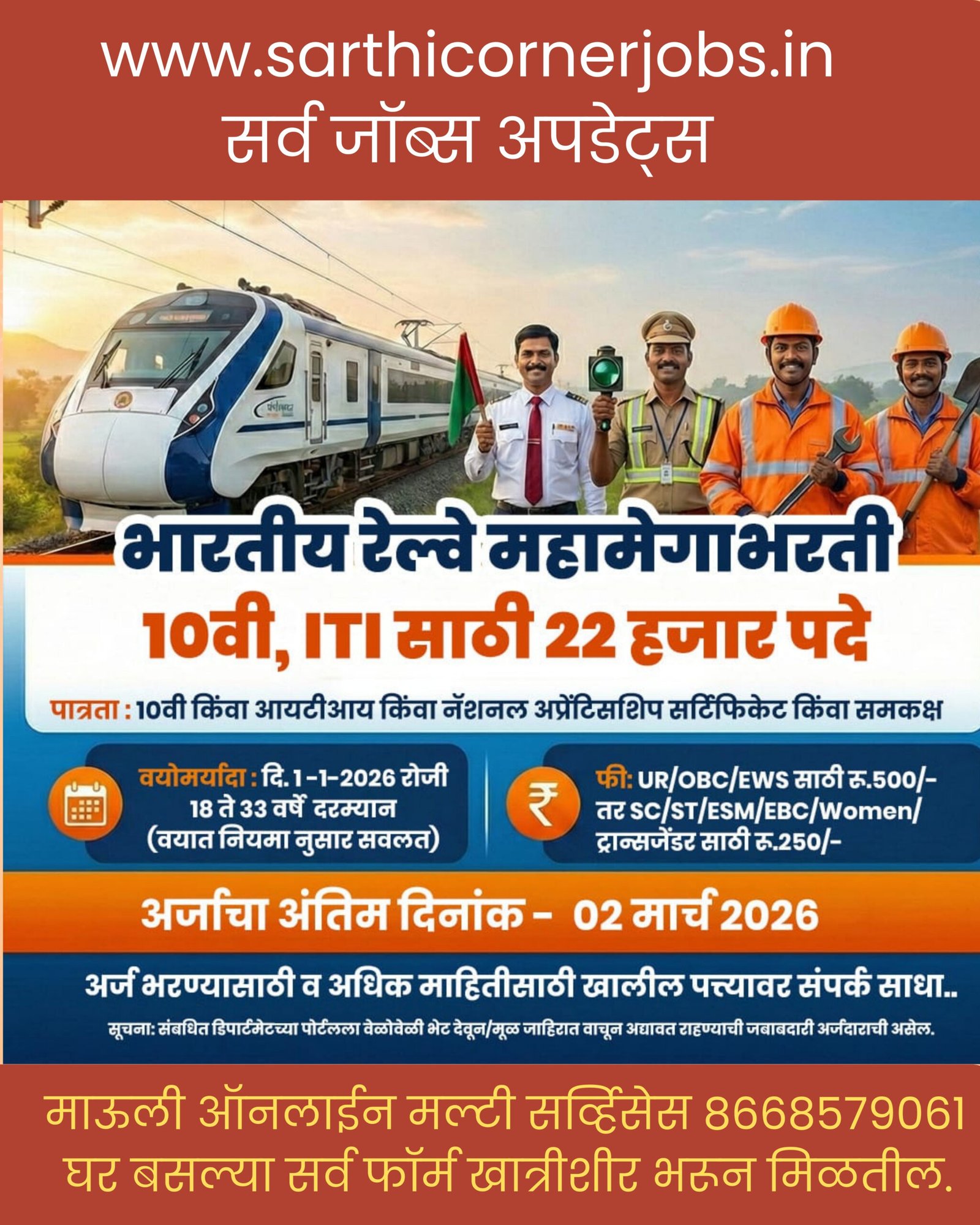www.SarthiCornerJobs.inभारतीय रेल्वेत 22195 जागांसाठी मेगाभरती :- RRB Group D Bharti 2026 |